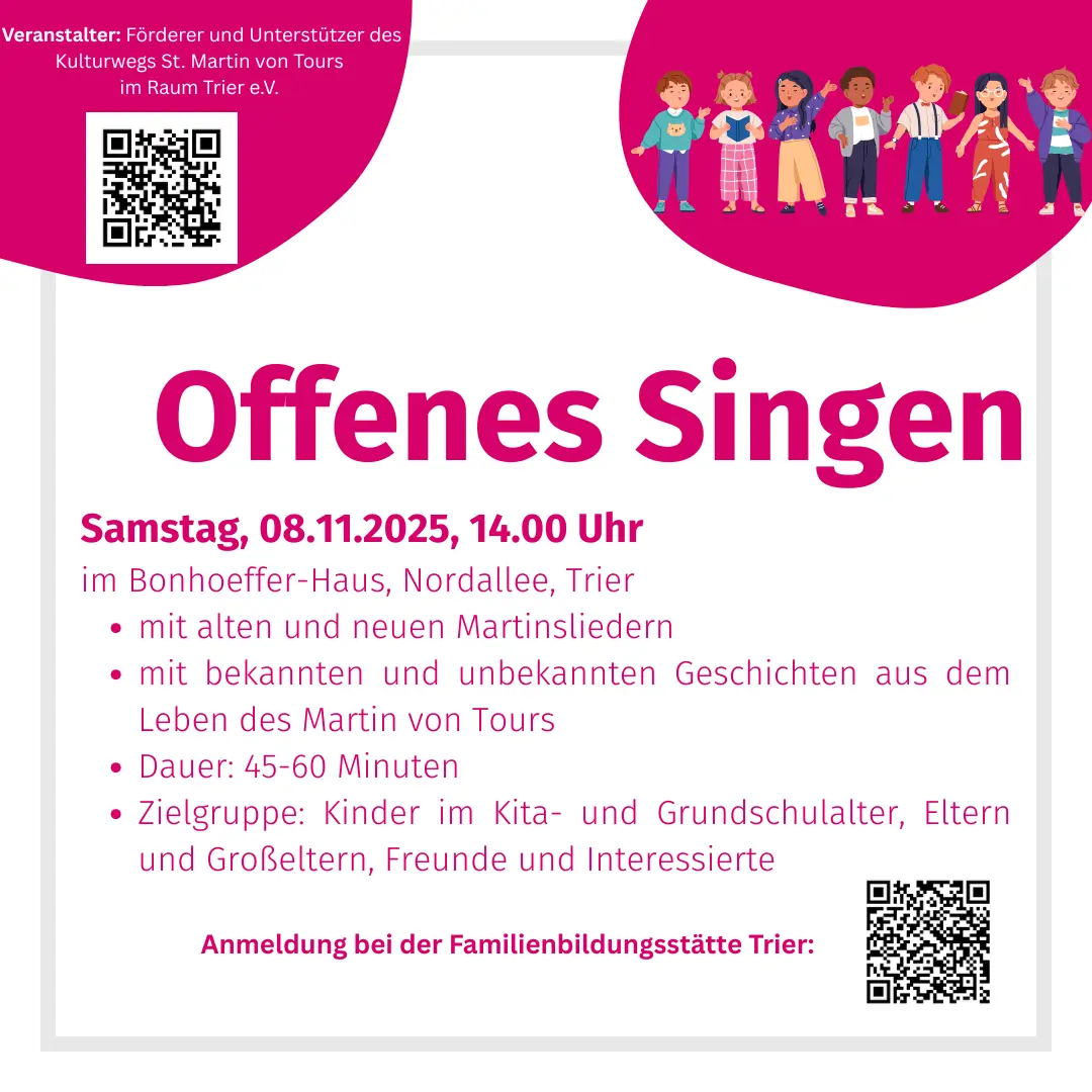 Der Martinusverein für die Region Trier bietet einen kurzweiligen Nachmittag generationsübergreifend für Jung und Alt an. Die Kinder im Kita- und Grundschulalter werden beteiligt und können mitmachen. Unter der Federführung von Sigrun Spies-Werle, ehemalige Musiklehrerin, werden alte und neue Martinslieder gesungen. Anhand von großformatigen Bildern erzählt Christoph Eiffler, ehemaliger Gemeindereferent, die klassische Geschichte von der Mantelteilung und das, was noch danach geschehen ist. Ein Schlüsselerlebnis im Leben des Martin von Tours. Danach wird noch eine zweite Geschichte erzählte. Immer wieder werden dazu Lieder gesungen.
