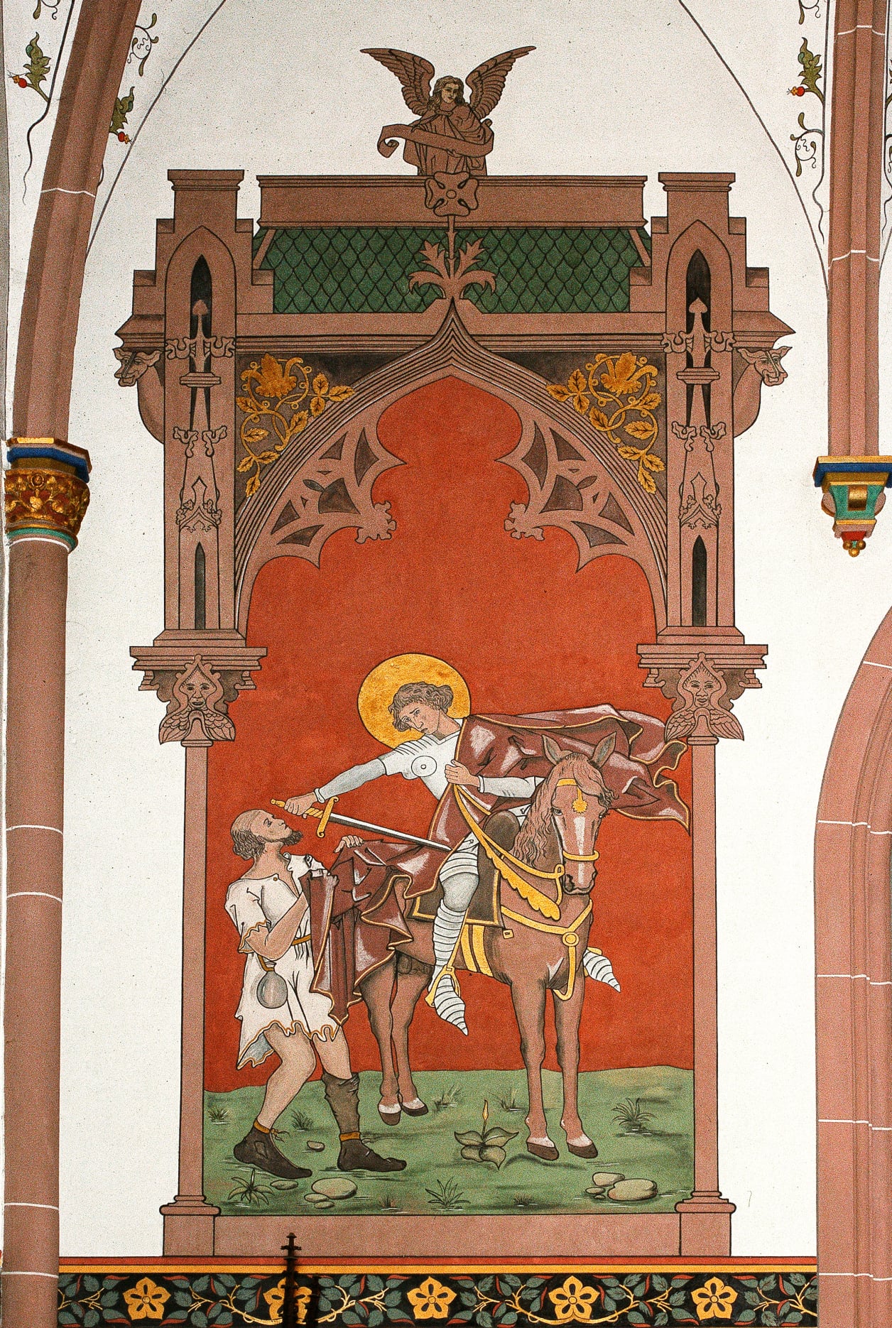 Ein jugendlicher Reiter, gerüstet wie ein mittelalterlicher Ritter ohne Kopfbedeckung (dafür mit einem Heiligenschein) auf einem bräunlichen Ross reitend. Er zerschneidet mit dem Schwert seinen braunen Mantel. Vor ihm der Bettler, in Lumpen gekleidet. Er hält schon die Hälfte von Martins Mantel in beiden Händen. Die Blicke der beiden sind einander zugewandt.