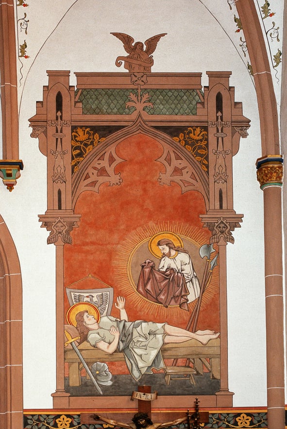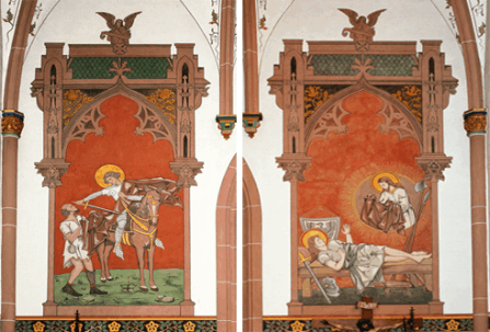 An der Stirnwand der beiden Seitenschiffe sind zwei Szenen aus Martins Leben dargestellt, die zusammenhängen: links die Mantelteilung, rechts die Christusvision im Traum.